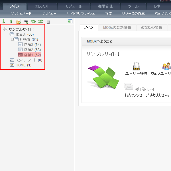 出来れば店舗1(62)以外のリソースはツリー構造のところに表示もさせたくありません。