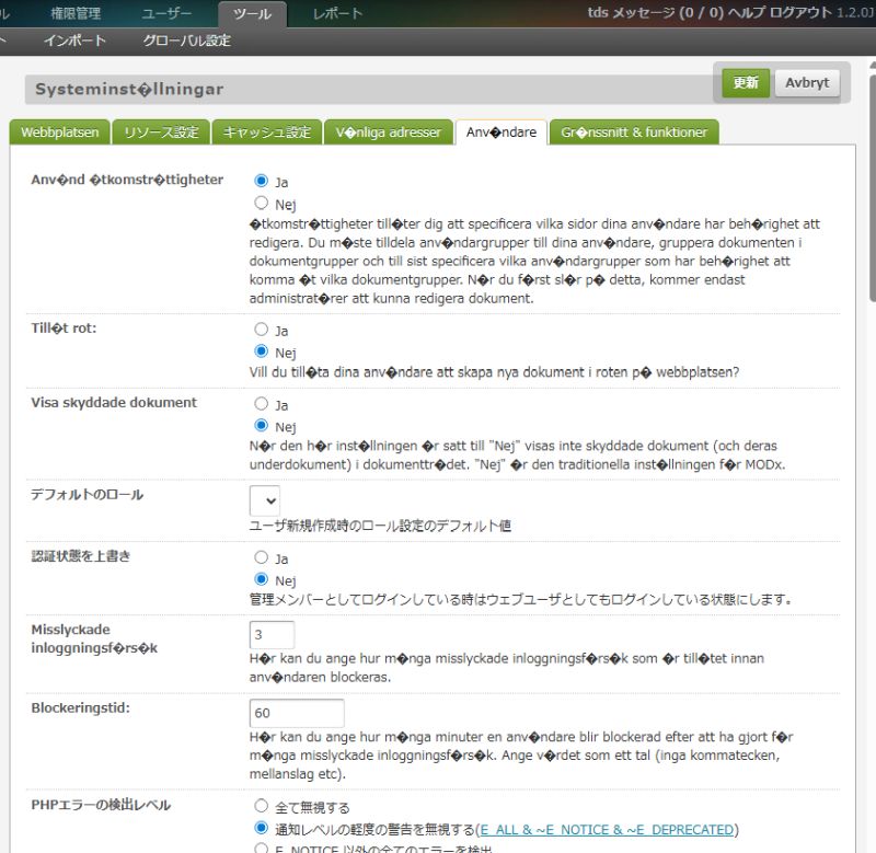 今回、MODXのバージョンを1.0.23Jから1.2.0Jに上げるのと一緒に、DBをMySQL5.5から8へ、PHPを7から8.3.8に上げたところ、添付のようにグローバル設定画面の一部がスウェーデン語(Gemini談)になってしまいました。解決方法があれば教えていただけると有り難いです。